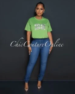 Valeria Green Front Rhinestones & Pearl Graphic Crop Shirt