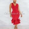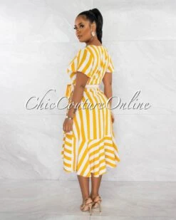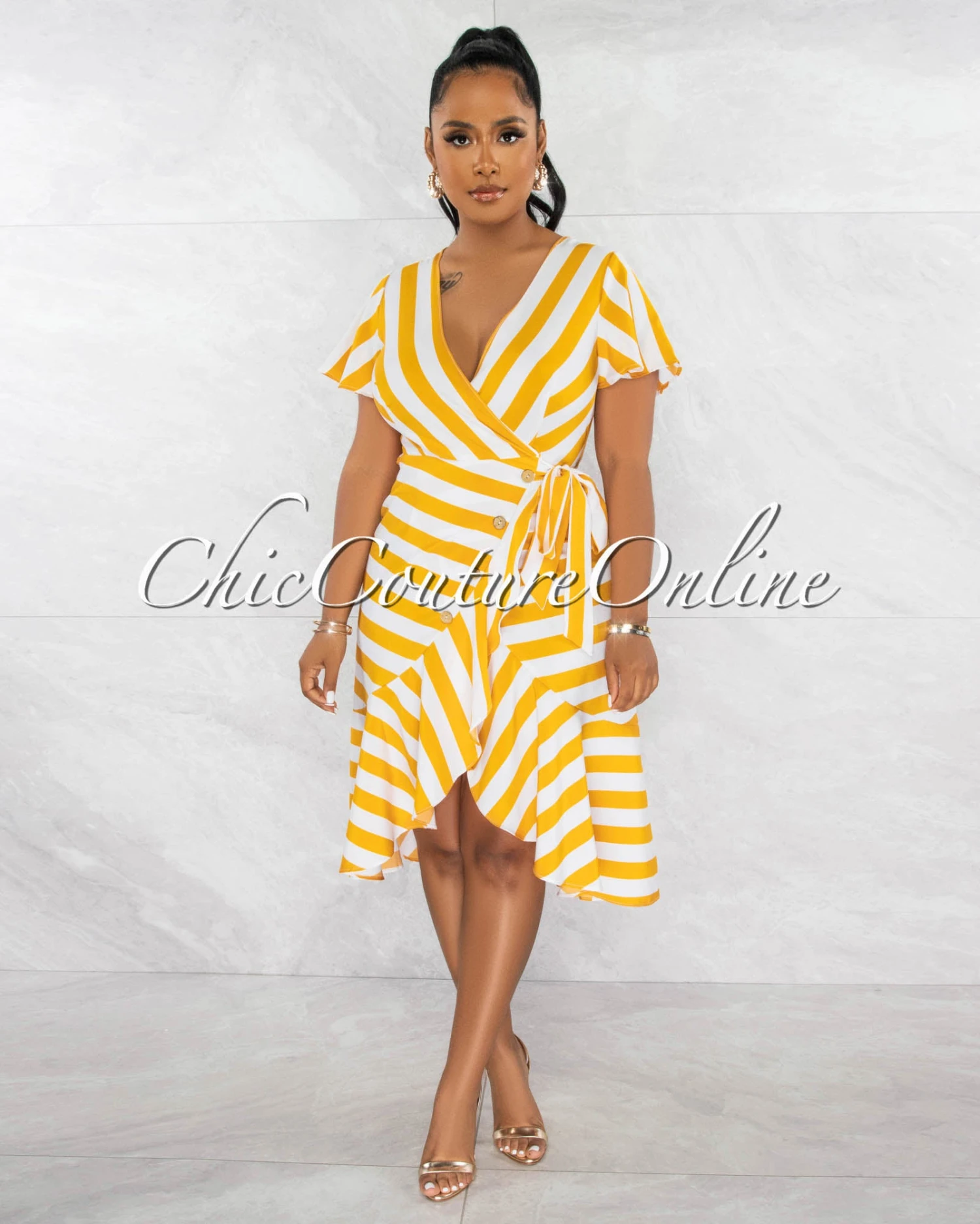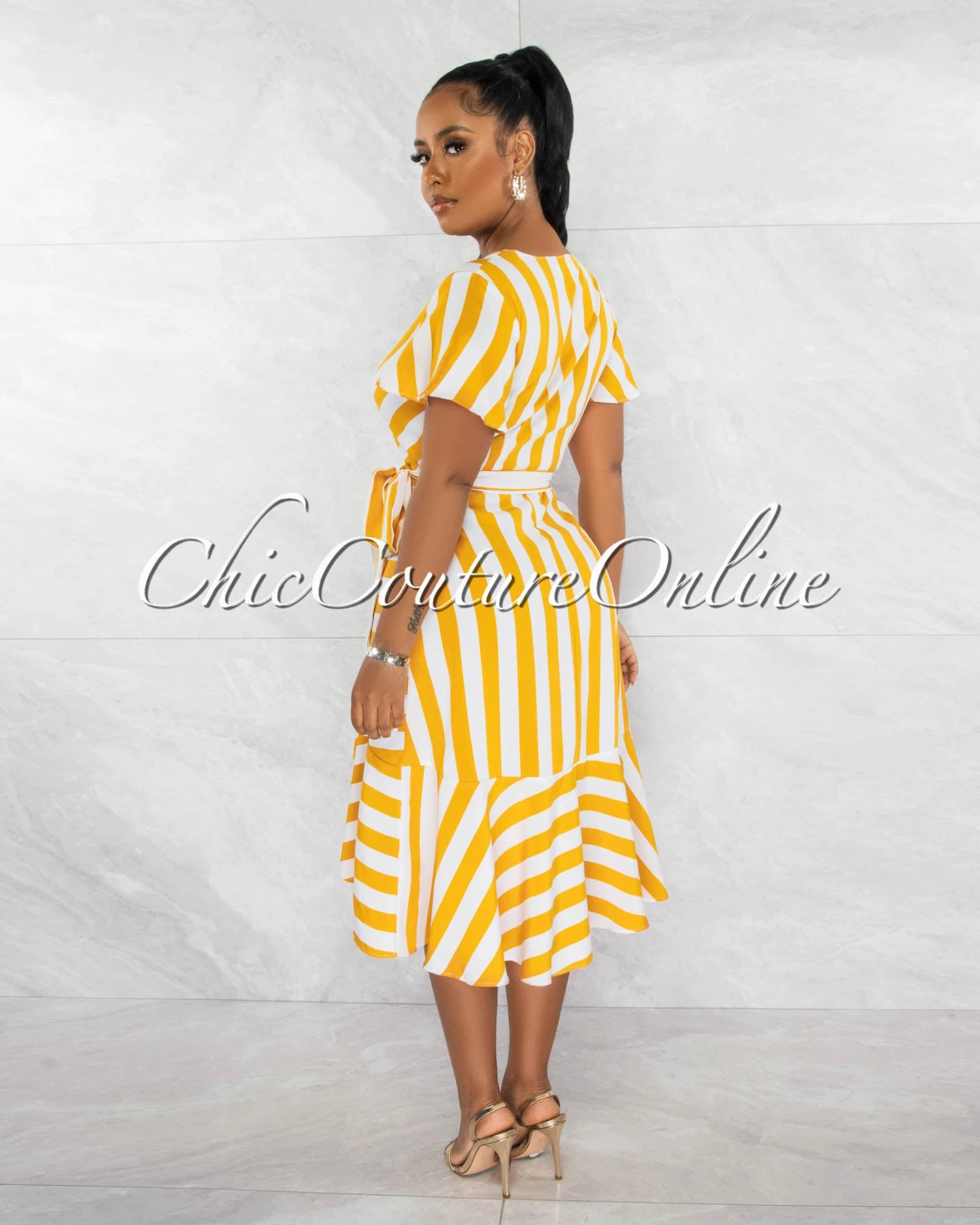 Basel Mustard White Stripes Wrap Ruffle Hem Dress