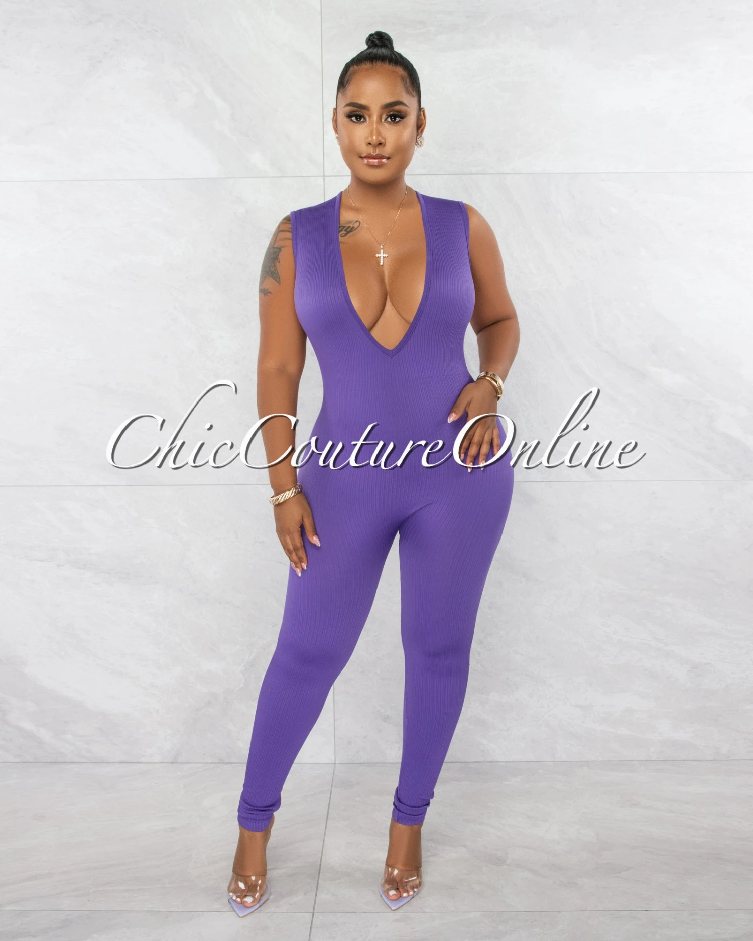Caitlyn Purple V-Neck Ribbed Sculpting Jumpsuit
