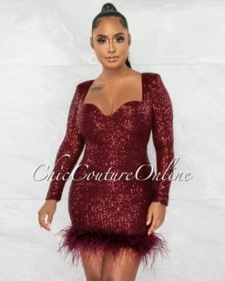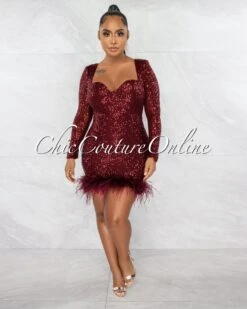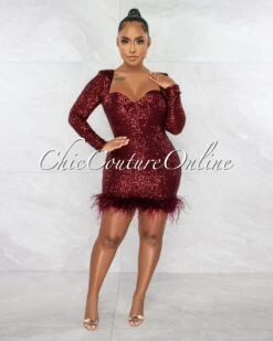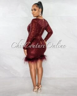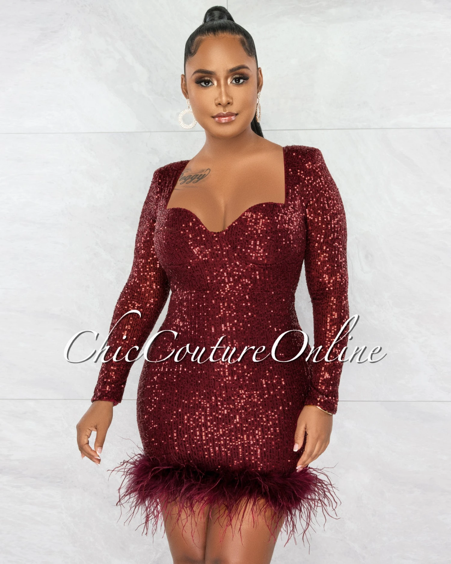 Daliana Wine Red Sequins Ruched Queen Anne Feather Hem Dress