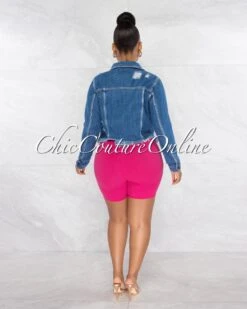 Showcase your cold size with this chic denim distressed jacket