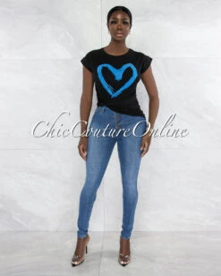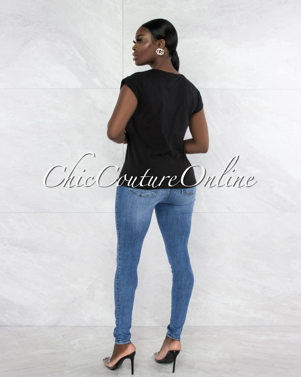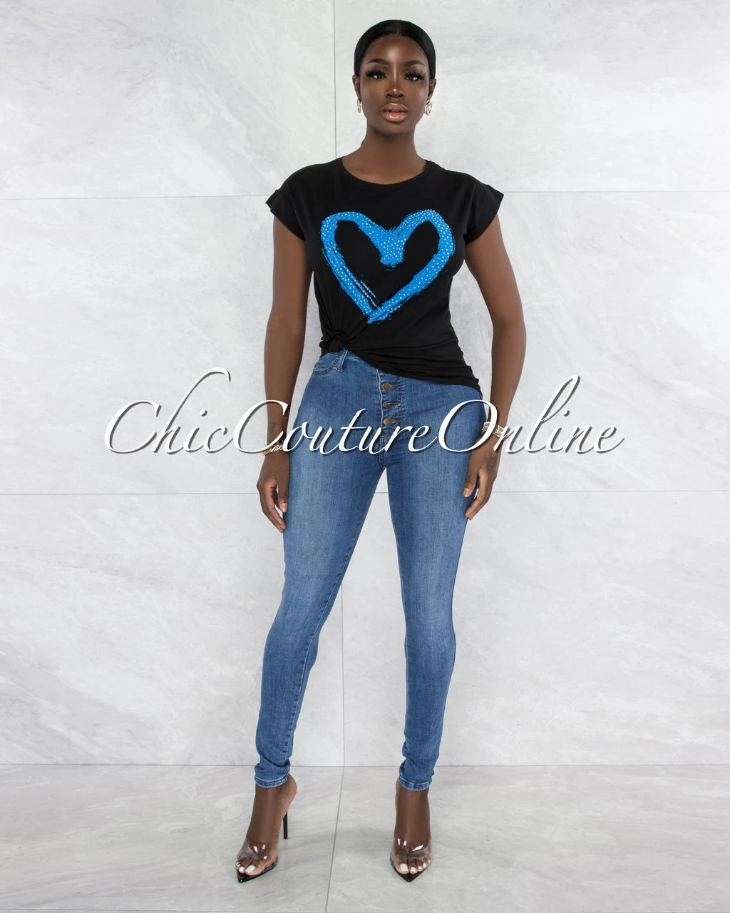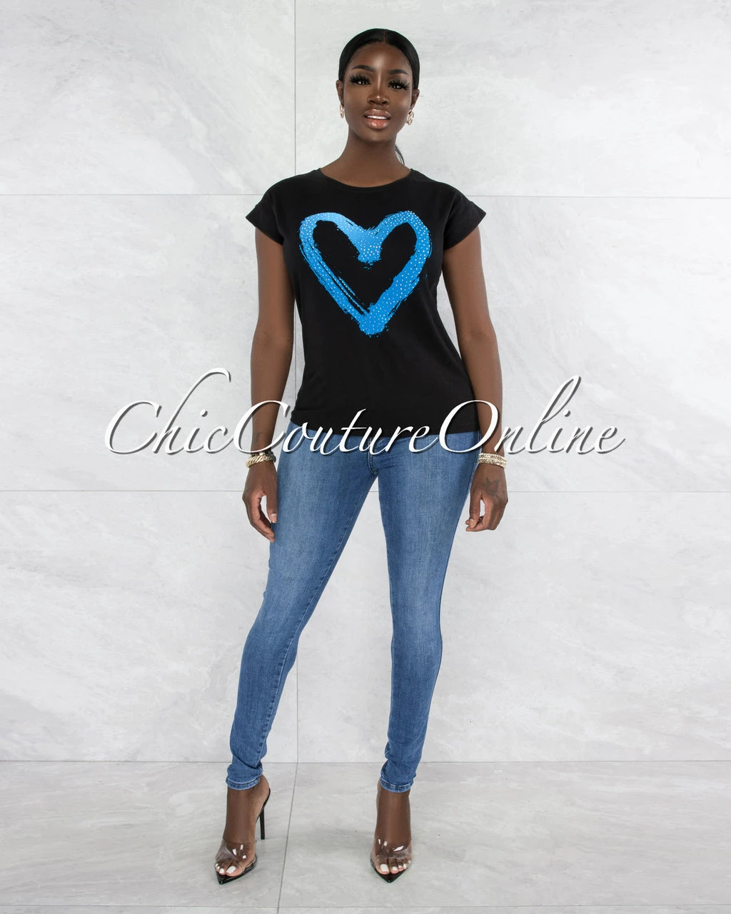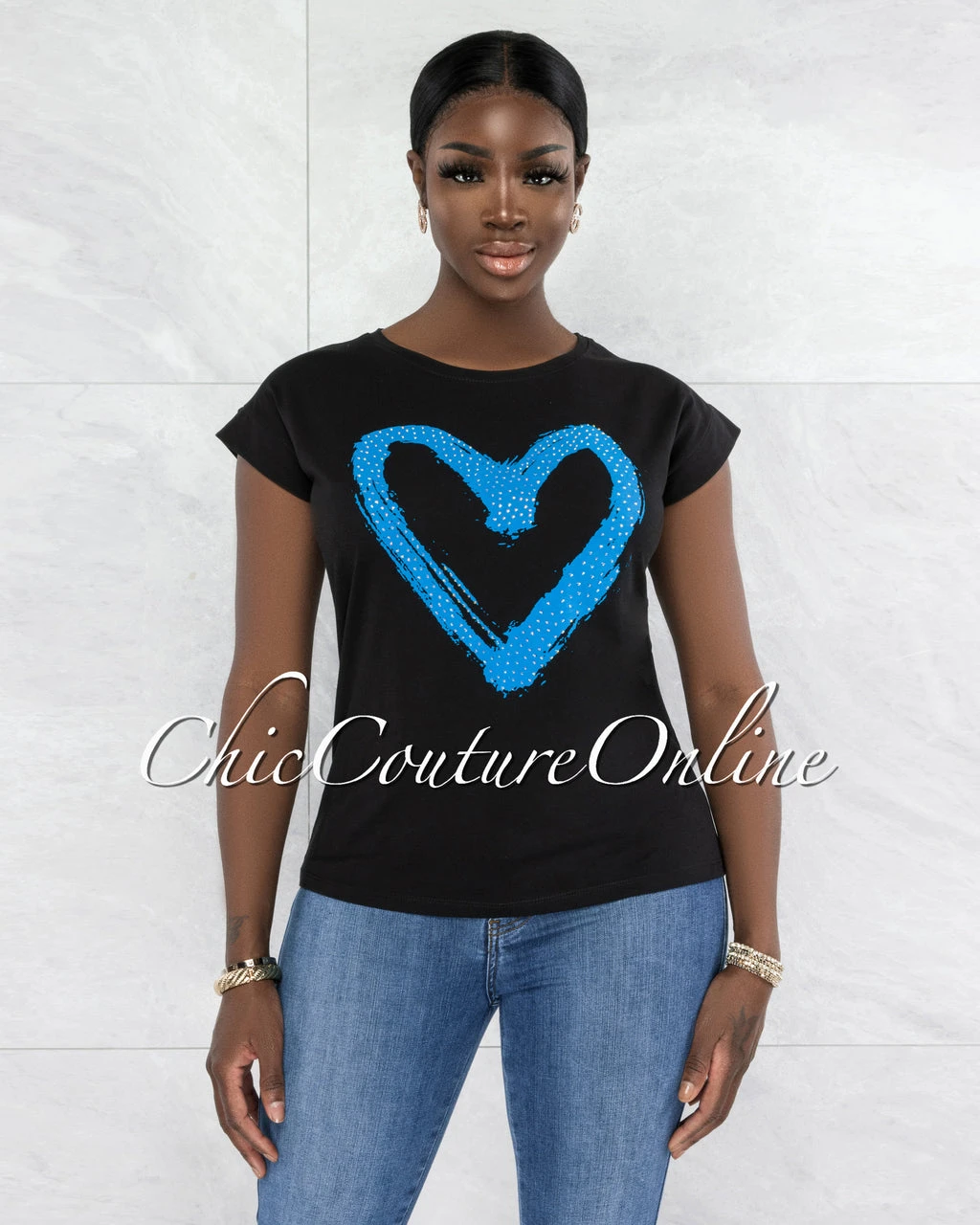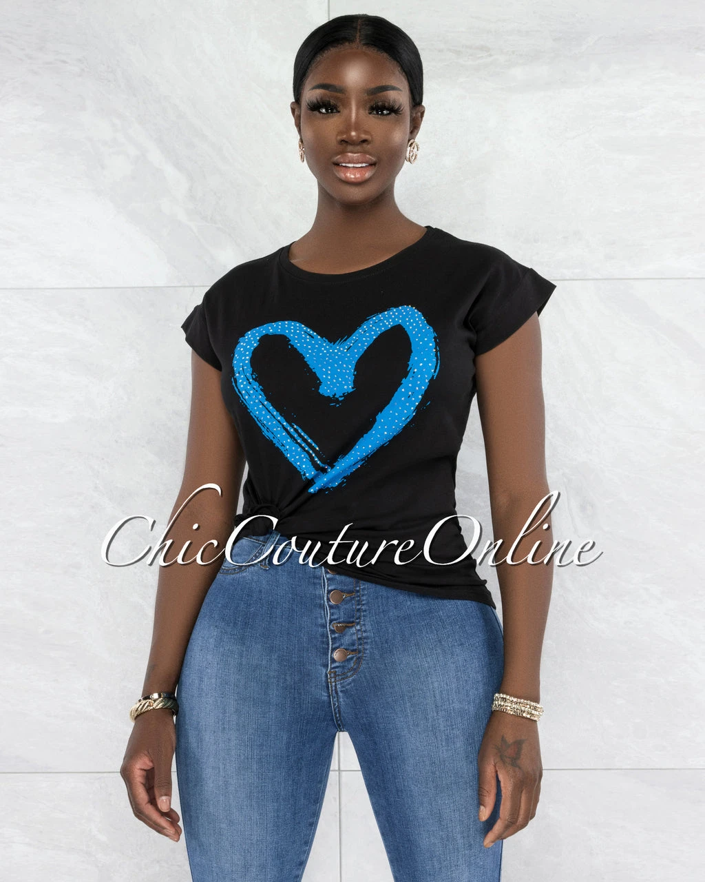Farry Black Blue Front Graphic Rhinestones T-Shirt