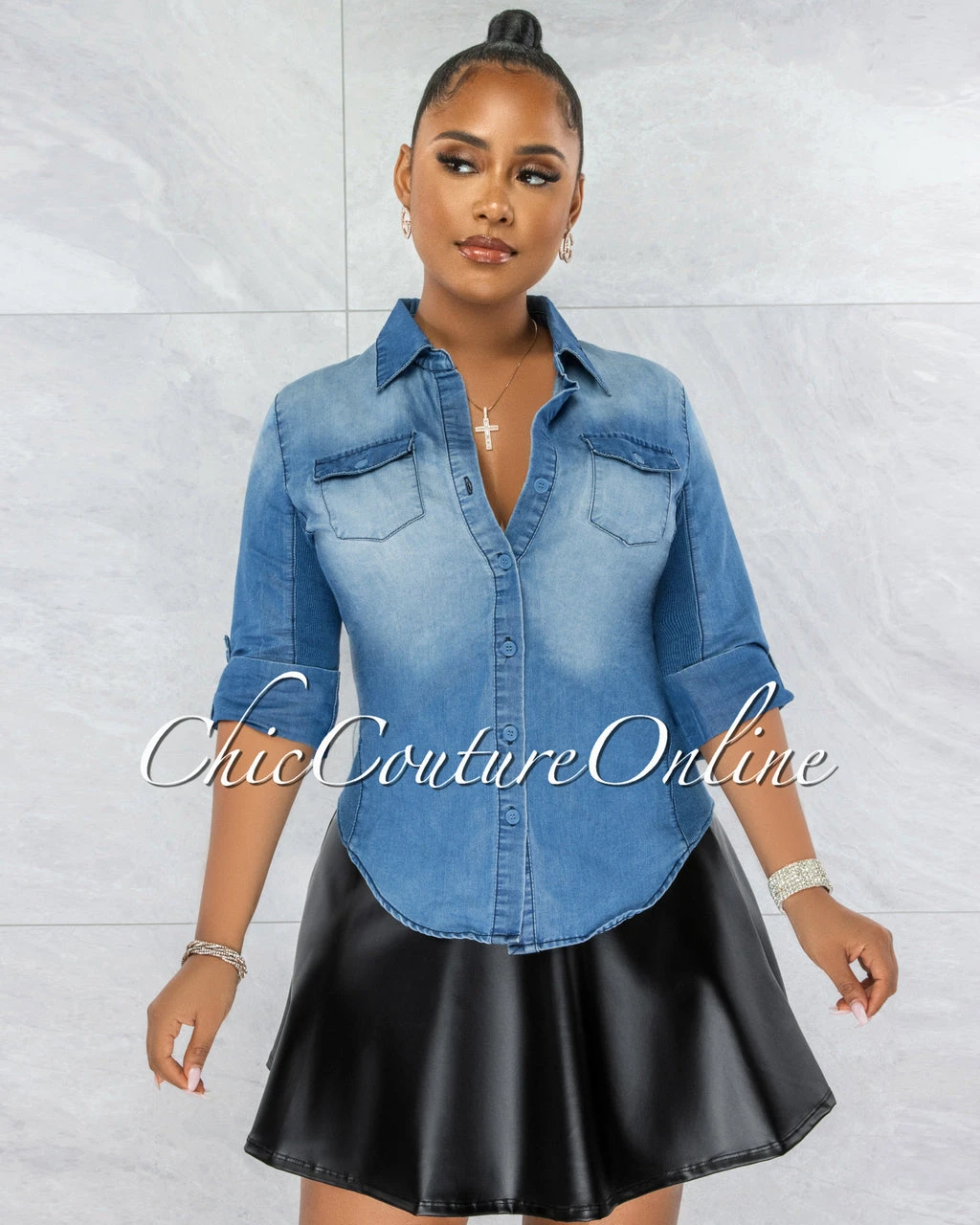 Hodson Medium Denim Front Buttons Ribbed Accent Shirt