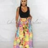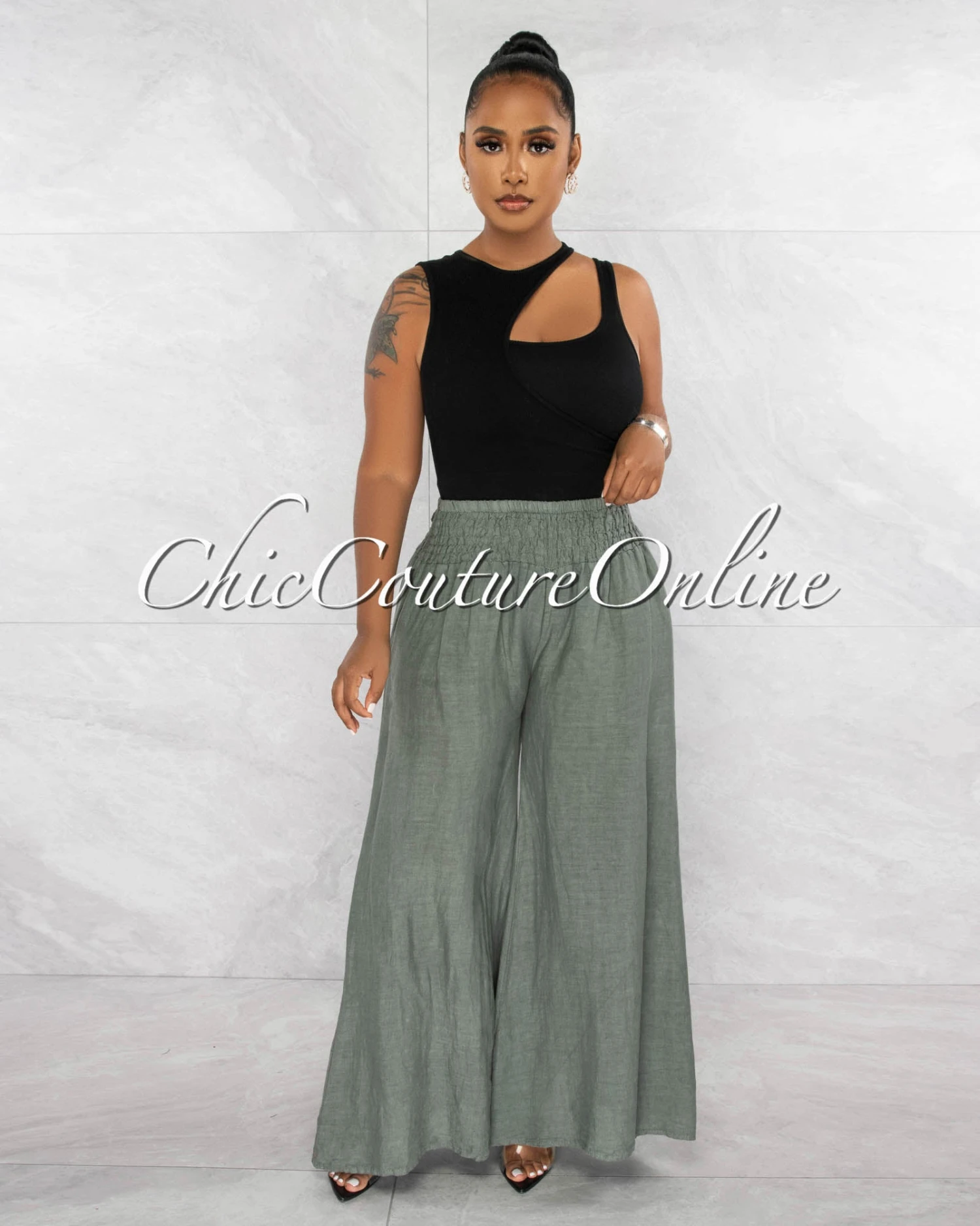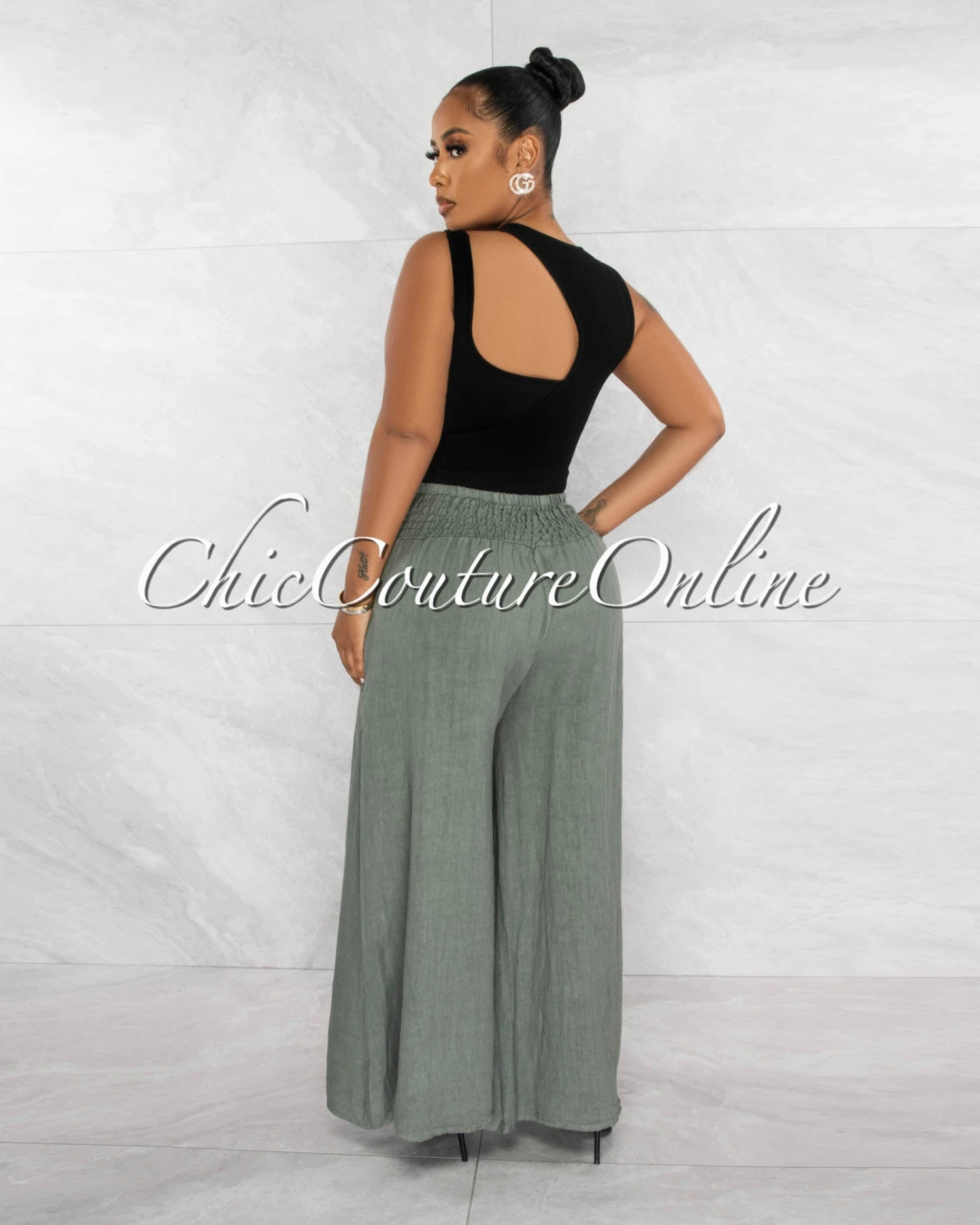 Lander Olive Green Smocked Waistband Wide Legs LINEN Pants