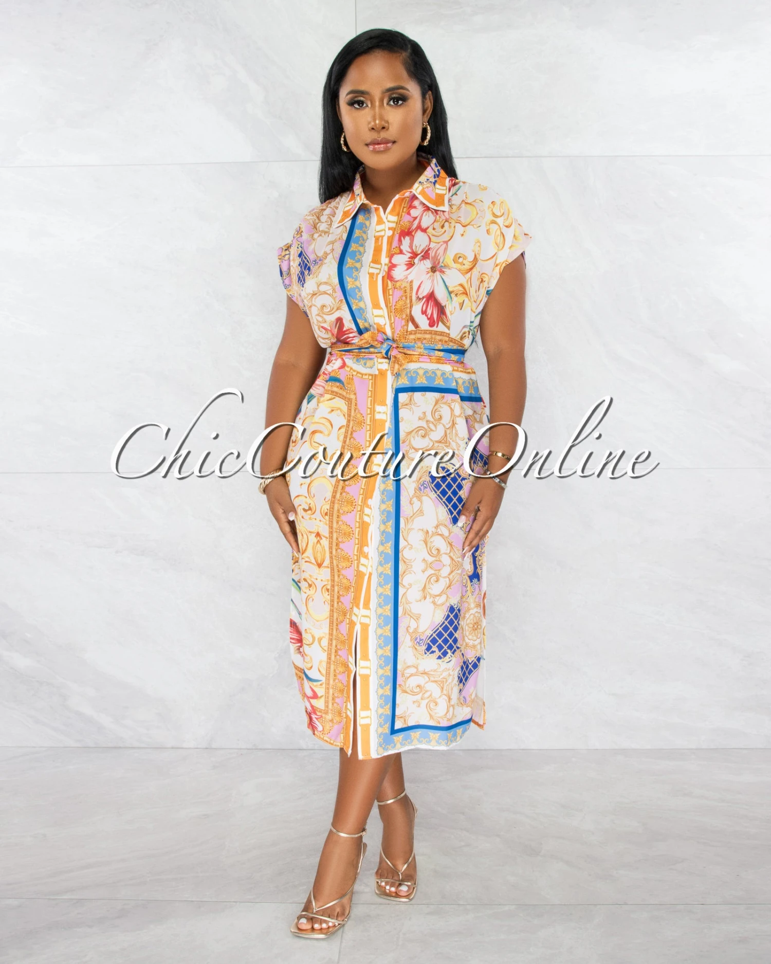 Easy, breezy and fluid define this effortless and slimming shirt dress. The beautiful cut is design to be worn uptown, downtown or simply, all around town.