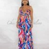 Gold link chains run the bust of this flattering sleeveless jumpsuit with wide legs and a sweetheart cut surplice neckline