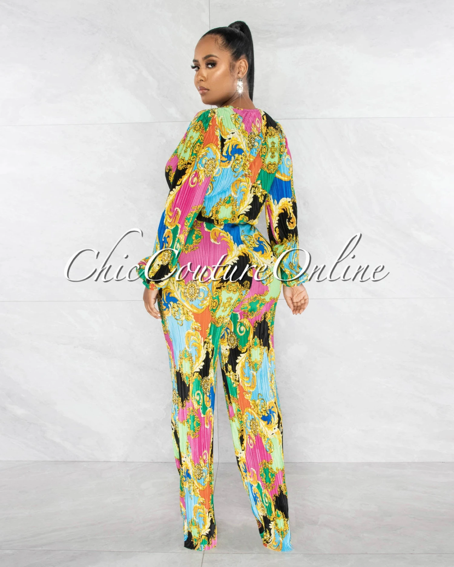 Bedecked in luxe print, this wide jumpsuit puts a spin on this playful one-and-done design.