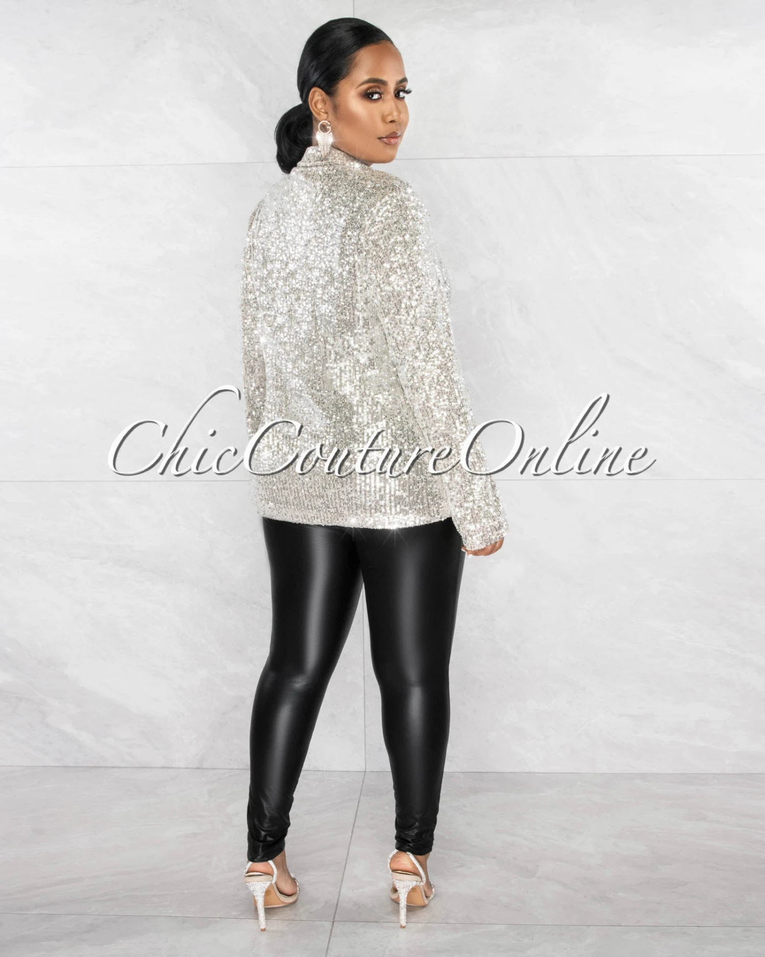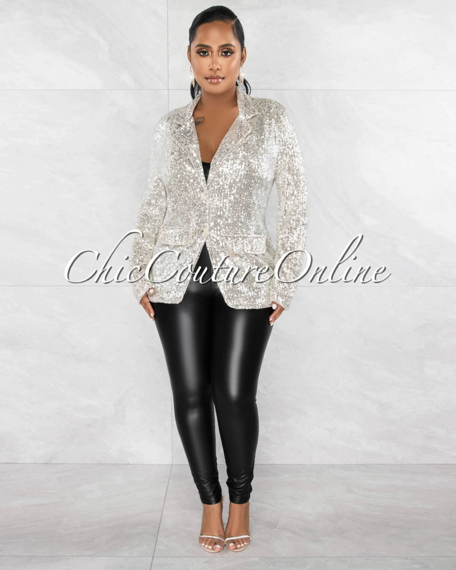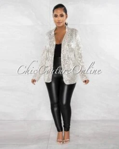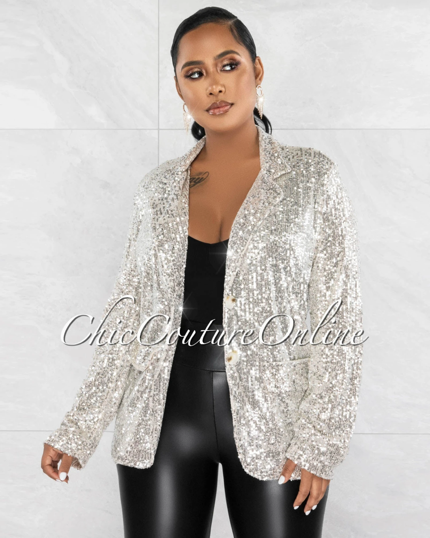 Tahsin Nude Silver Sequins Long Sleeves Blazer